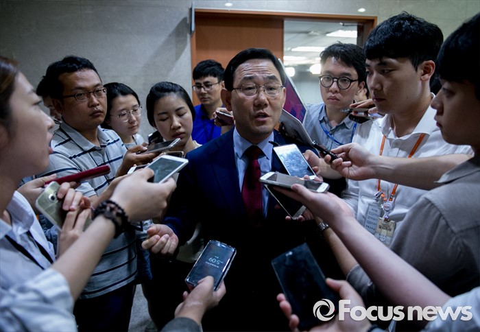 (서울=포커스뉴스) 전당대회 출마를 선언한 주호영 새누리당 의원이 18일 오후 서울 여의도 국회 정론관에서 추가로 공개된 윤상현 의원의 공천개입 녹취록과 관련 성명서를 발표한 뒤 취재진 질문에 답하고 있다.