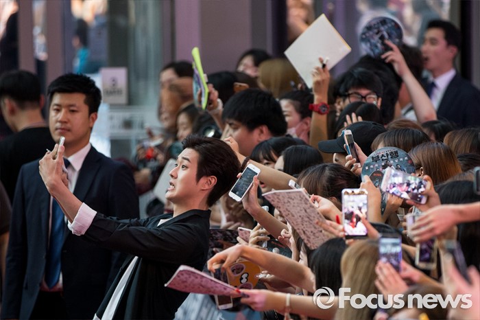 (서울=포커스뉴스) 18일 오후 서울 영등포구 타임스퀘어에서 열린 영화 '부산행' 레드카펫 행사에 참석한 배우 최우식이 팬들과 함께 셀카를 찍고 있다.