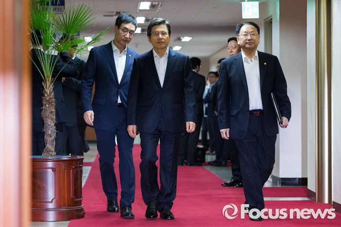 (서울=포커스뉴스) 황교안(가운데) 국무총리가 19일 오전 서울 종로구 정부서울청사에서 열린 국무회의에 참석하고 있다. 왼쪽부터 이준식 사회부총리 겸 교육부 장관, 황 총리, 유일호경제부총리 겸 기획재정부 장관.