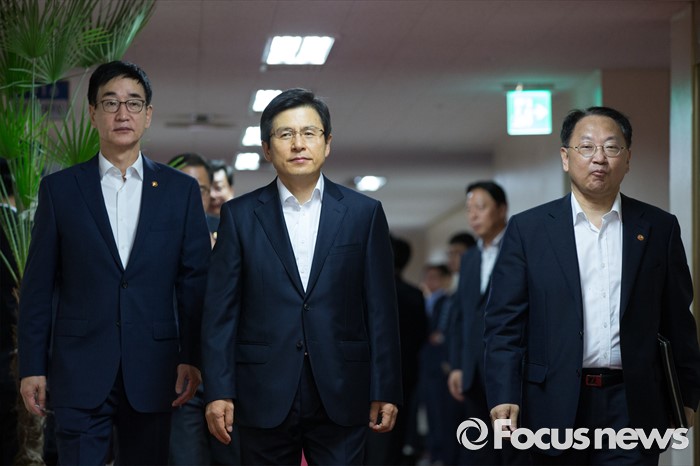 (서울=포커스뉴스) 황교안(가운데) 국무총리가 19일 오전 서울 종로구 정부서울청사에서 열린 국무회의에 참석하고 있다. 왼쪽부터 이준식 사회부총리 겸 교육부 장관, 황 총리, 유일호경제부총리 겸 기획재정부 장관.