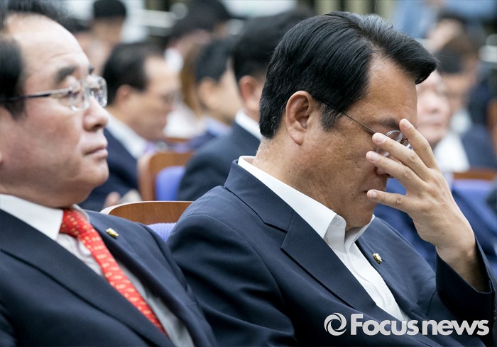 (서울=포커스뉴스) 19일 오전 서울 여의도 국회에서 열린 새누리당 의원총회에 참석한 정진석(오른쪽) 원내대표가 얼굴을 만지고 있다.