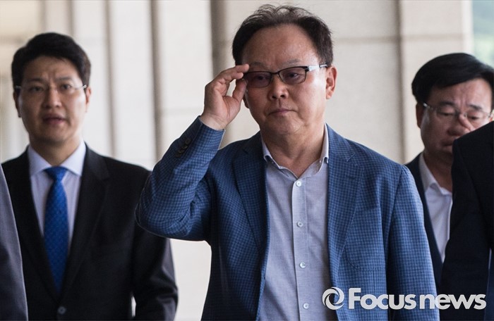 (서울=포커스뉴스) 롯데케미칼 270억원대 소송 사기에 연루된 혐의를 받는 기준(가운데) 전 롯데물산 사장이 19일 오전 서울중앙지검에 피의자 신분으로 출석하고 있다.