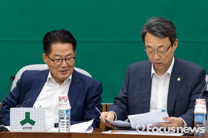 (서울=포커스뉴스) 박지원(왼쪽) 국민의당 비상대책위원장과 김성식 정책위의장이 19일 오전 서울 여의도 국회에서 열린 의원총회에 참석해 대화하고 있다.