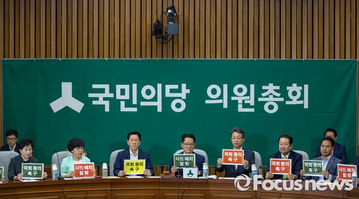 (서울=포커스뉴스) 박지원(가운데) 국민의당 비상대책위원장을 비롯한 의원들이 19일 오전 서울 여의도 국회에서 열린 의원총회에 참석해 사진촬영을 하기 위해 '사드배치 철회'를 촉구하는 피켓을 들고 있다.