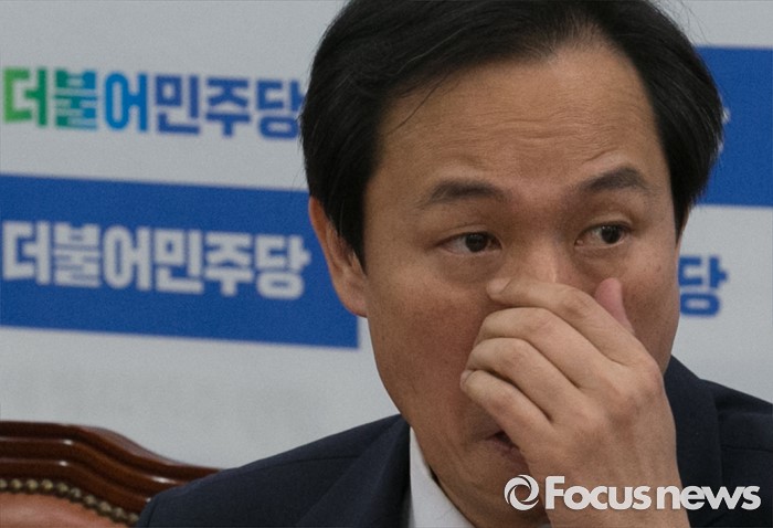 (서울=포커스뉴스) 19일 오전 서울 여의도 국회에서 열린 더불어민주당 사드대책위원회의에 참석한 우상호 원내대표가 얼굴을 만지고 있다.
