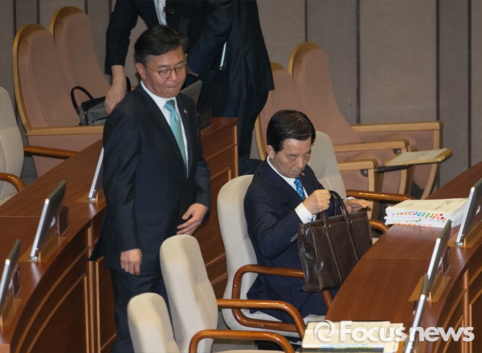 (서울=포커스뉴스) 19일 오전 서울 여의도 국회에서 열린 344회 국회(임시회) 1차 본회의, 사드(THAAD·고고도미사일방어체계) 배치에 대한 긴급현안질문에 한민구(오른쪽) 국방부 장관, 홍용표 통일부 장관이 참석하고 있다.