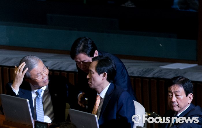 (서울=포커스뉴스) 19일 오전 서울 여의도 국회에서 열린 344회 국회(임시회) 1차 본회의, 사드(THAAD·고고도미사일방어체계) 배치에 대한 긴급현안질문에 참석한 김종인 더불어민주당 비대위 대표, 우상호 원내대표, 김영춘 의원이 대화하고 있다.