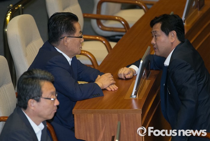 (서울=포커스뉴스) 19일 오전 서울 여의도 국회에서 열린 344회 국회(임시회) 1차 본회의, 사드(THAAD·고고도미사일방어체계) 배치에 대한 긴급현안질문에 참석한 박지원(왼쪽) 국민의당 비상대책위원장과 김관영 원내수석부대표가 대화하고 있다.