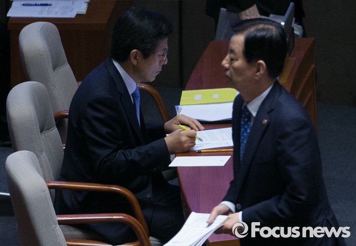 (서울=포커스뉴스) 19일 오전 서울 여의도 국회에서 열린 344회 국회(임시회) 1차 본회의, 사드(THAAD·고고도미사일방어체계) 배치에 대한 긴급현안질문에 참석한 한민구 국방부 장관이 의원들의 질문에 답한 뒤 자리로 향하고 있다. 왼쪽은 황교안 국무총리.