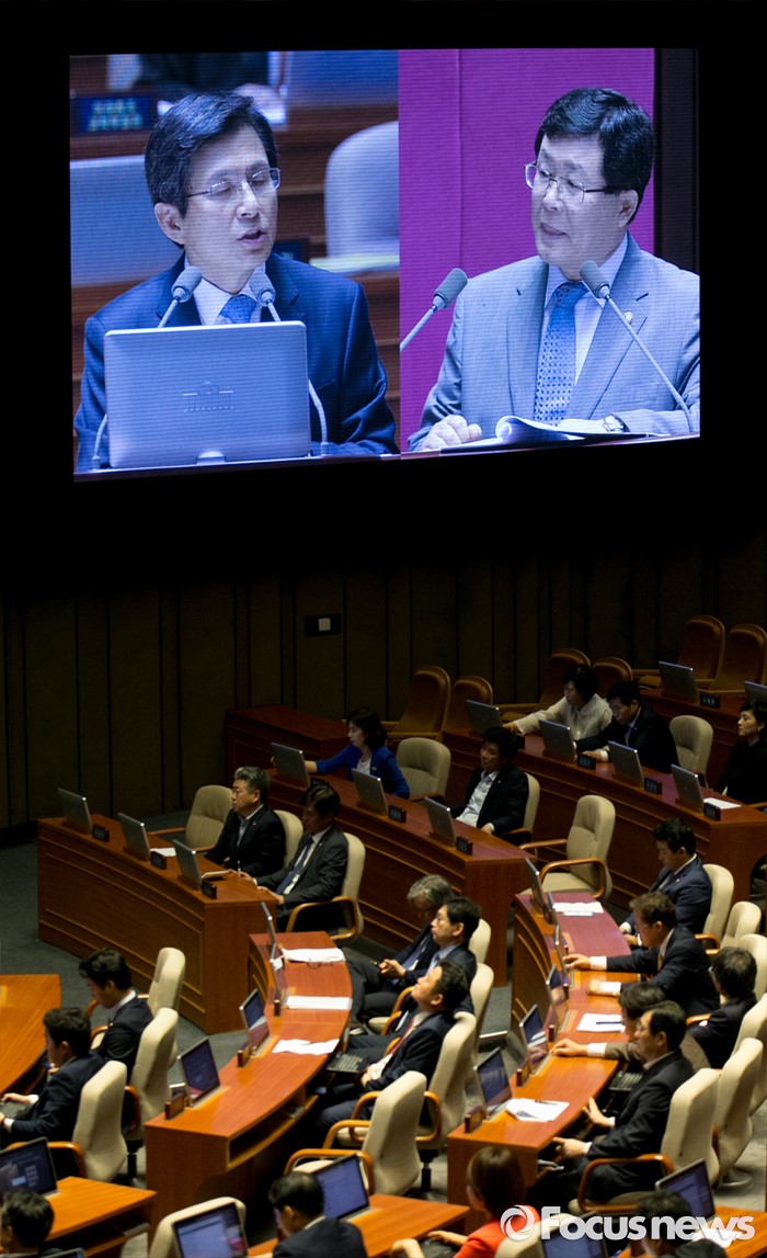 (서울=포커스뉴스) 19일 오전 서울 여의도 국회에서 열린 344회 국회(임시회) 1차 본회의, 사드(THAAD·고고도미사일방어체계) 배치에 대한 긴급현안질문에 참석한 설훈 더불어민주당 의원이 황교안 국무총리에게 질문하고 있다.