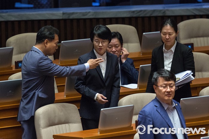 (서울=포커스뉴스) 박선숙(왼쪽 두 번째) 국민의당 의원이 19일 오전 서울 여의도 국회에서 열린 제344회 국회(임시회) 1차 본회의에 참석해 동료 의원들과 대화 하고 있다.