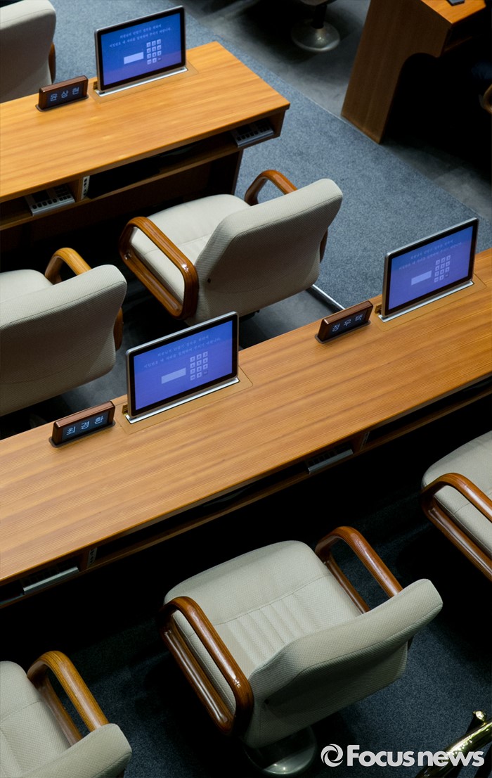(서울=포커스뉴스) 19일 오전 서울 여의도 국회에서 열린 344회 국회(임시회) 1차 본회의, 사드(THAAD·고고도미사일방어체계) 배치에 대한 긴급현안질문에 공천개입 논란 등으로 불참한 최경환(왼쪽 아래), 윤상현(오른쪽 위) 새누리당 의원의 빈 자리가 보이고 있다.