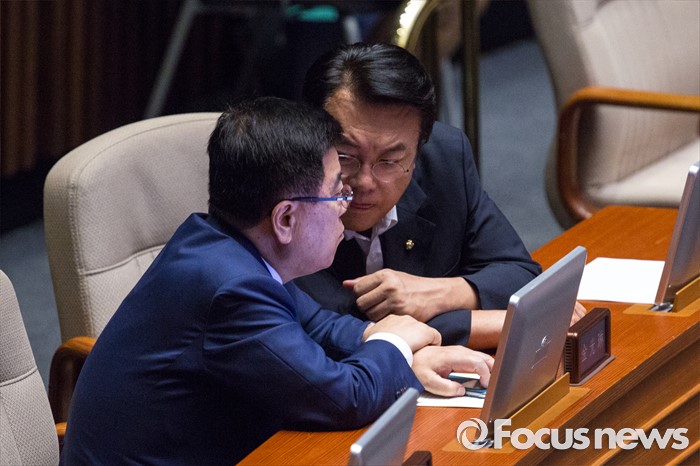 (서울=포커스뉴스) 정진석(오른쪽) 새누리당 원내대표와 김광림 정책위의장이 19일 오전 서울 여의도 국회에서 열린 제344회 국회(임시회) 1차 본회의, 사드(THAAD, 고고도미사일방어체계) 배치에 대한 긴급현안질문에 참석해 대화 하고 있다.