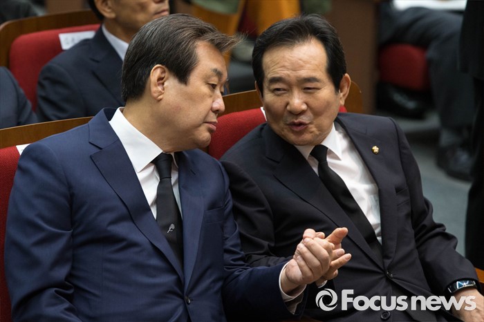 (서울=포커스뉴스) 19일 오전 서울 동작구 국립현충원 현충관에서 열린 우남 이승만 전 대통령 51주기 추모식에 참석한 정세균(오른쪽) 국회의장과 김무성 새누리당 의원이 대화를 나누고 있다.
