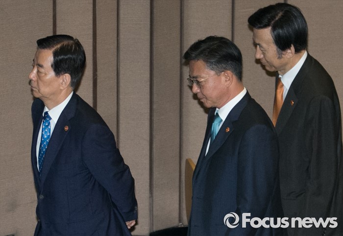 (서울=포커스뉴스) 19일 오전 서울 여의도 국회에서 344회 국회(임시회) 1차 본회의, 사드(THAAD·고고도미사일방어체계) 배치에 대한 긴급현안질문을 마친 뒤 한민구(왼쪽부터) 국방부 장관, 홍용표 통일부 장관, 윤병세 외교부 장관이 퇴장하고 있다.