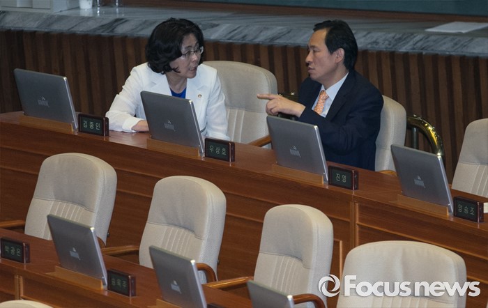 (서울=포커스뉴스) 19일 오전 서울 여의도 국회에서 열린 344회 국회(임시회) 1차 본회의, 사드(THAAD·고고도미사일방어체계) 배치에 대한 긴급현안질문에 참석한 우상호(오른쪽) 더불어민주당 원내대표와 유승희 의원이 대화하고 있다.