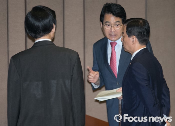 (서울=포커스뉴스) 19일 오전 서울 여의도 국회에서 344회 국회(임시회) 1차 본회의, 사드(THAAD·고고도미사일방어체계) 배치에 대한 긴급현안질문을 마친 뒤 심재철 국회 부의장과 한민구 국방부 장관, 윤병세 외교부 장관 등이 대화하고 있다.