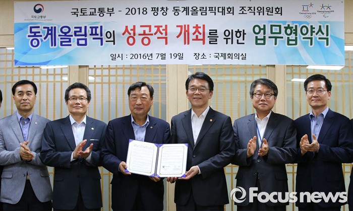 (세종=포커스뉴스) 강호인 국토교통부장관이 19일 오후 세종시 정부세종청사 국토부 접견실에서 열린 평창동계올림픽 성공 개최를 위한 업무협약식에서 이희범 평창동계올림픽 조직위원장과 협약을 채결한 뒤 기념촬영하고 있다.