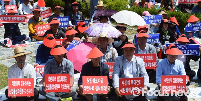 (세종=포커스뉴스) 충남 당진시민들이 19일 세종시 정부세종청사 산업통상자원부 앞에서 석탄화력발전소인 당진 에코파워 건설 철회를 촉구하고 있다.