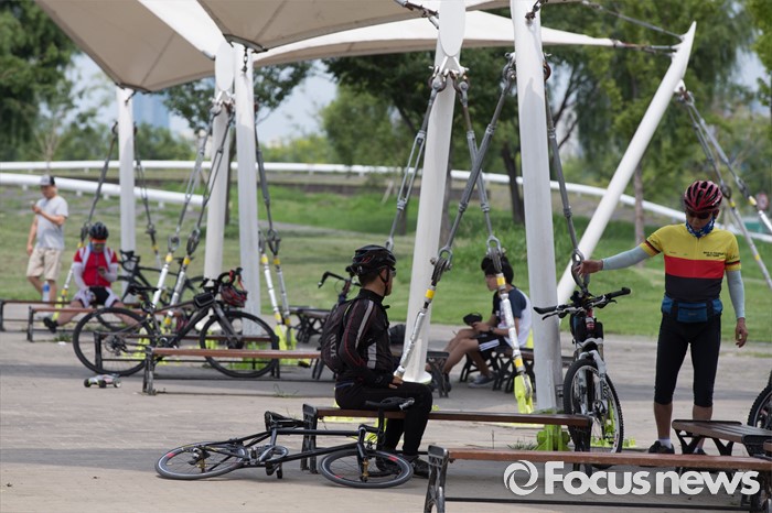 (서울=포커스뉴스) 서울 지역에 폭염주의보가 내린 19일 오후 서울 서초구 반포한강공원 일대에서 시민들이 자전거에서 내려 휴식을 취하고 있다.