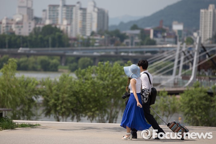 (서울=포커스뉴스) 서울 지역에 폭염주의보가 내린 19일 오후 서울 서초구 반포한강공원 일대에서 시민들이 걸어가고 있다.