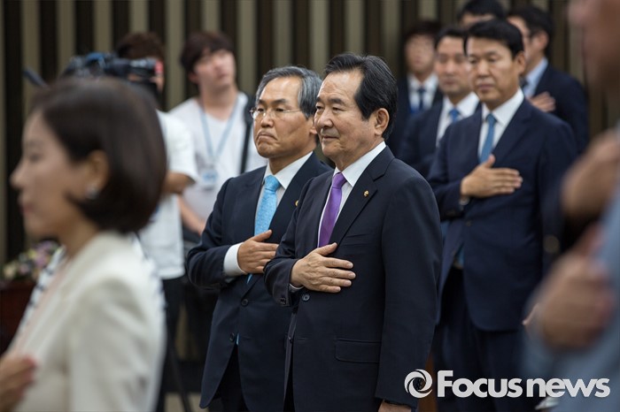 (서울=포커스뉴스) 정세균(오른쪽) 국회의장과 우윤근(오른쪽 두 번째) 국회 사무총장이 19일 오후 서울 여의도 국회에서 열린 '친인척 보좌직원 채용 국회윤리법규 개정 위한 공청회'에 참석해 국민의례 하고 있다.