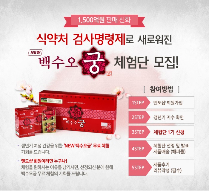 선정 결과는 쇼핑몰과 개별 공지를 통해 발표한다. 체험단으로 선정되면 소비자가 8만원 상당의 '뉴 백수오궁' 1개월분을 무료로 증정한다.
