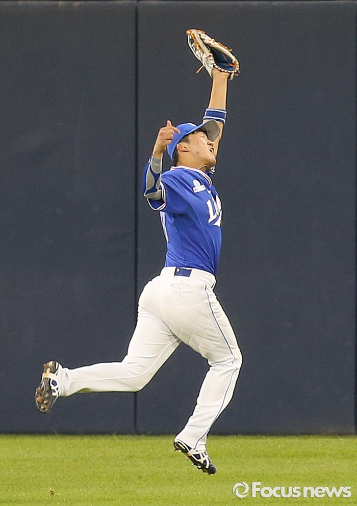 (서울=포커스뉴스) 19일 서울 잠실구장에서 열린 2016 프로야구 삼성두산 경기 4회말 1사 만루에서 삼성 중견수 박해민이 역동작으로 두산 양의지의 희생플라이 타구를 잡고 있다.