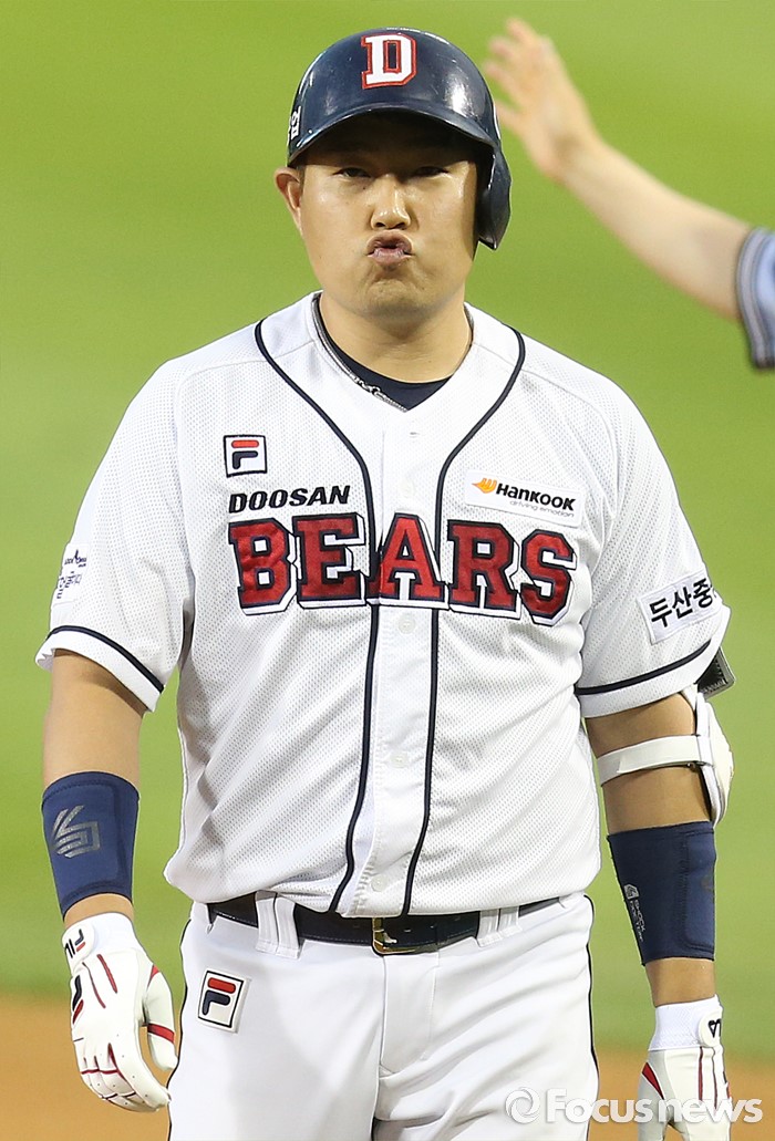 (서울=포커스뉴스) 19일 서울 잠실구장에서 열린 2016 프로야구 삼성두산 경기 4회말 1사 만루에서 두산 양의지가 선취 득점을 올리는 중견수 희생플라이를 치고 더그아웃으로 향하고 있다.