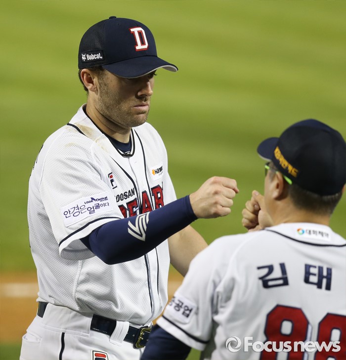 (서울=포커스뉴스) 19일 서울 잠실구장에서 열린 2016 프로야구 삼성-두산 경기에서 2점 홈런으로 결승타점을 기록한 에반스가 김태형 감독의 환영을 받고 있다.