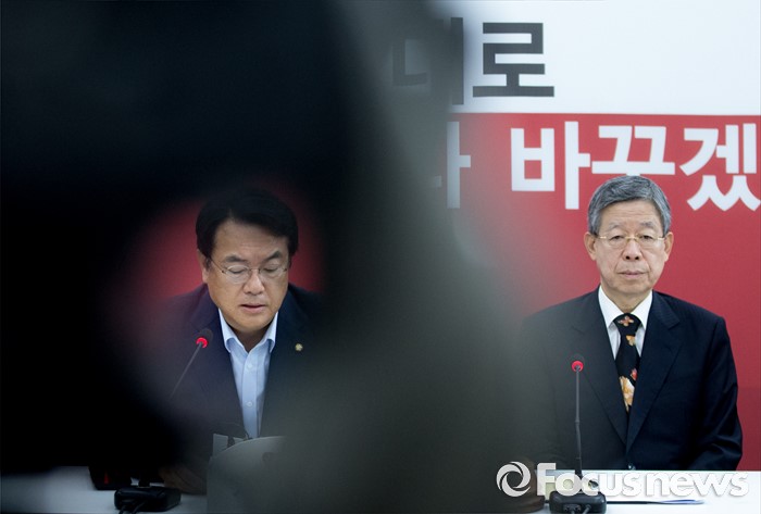 (서울=포커스뉴스) 20일 오전 서울 여의도 국회에서 열린 새누리당 혁신비상대책위원회의에 참석한 정진석 원내대표가 발언하고 있다. 오른쪽은 김희옥 위원장.