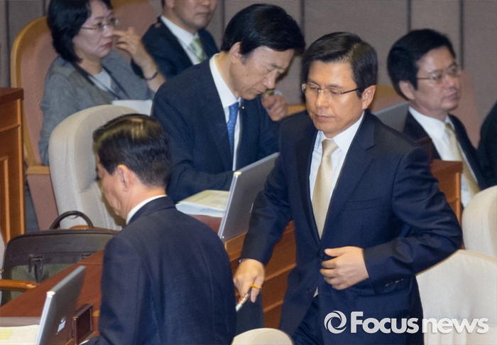 (서울=포커스뉴스) 20일 오전 서울 여의도 국회에서 열린 344회 국회(임시회) 2차 본회의, 사드(THAAD·고고도미사일방어체계) 배치에 대한 긴급현안질문에 참석한 황교안 국무총리, 한민구 국방부 장관 등이 의원들의 질문에 답하기 위해 분주히 이동하고 있다.