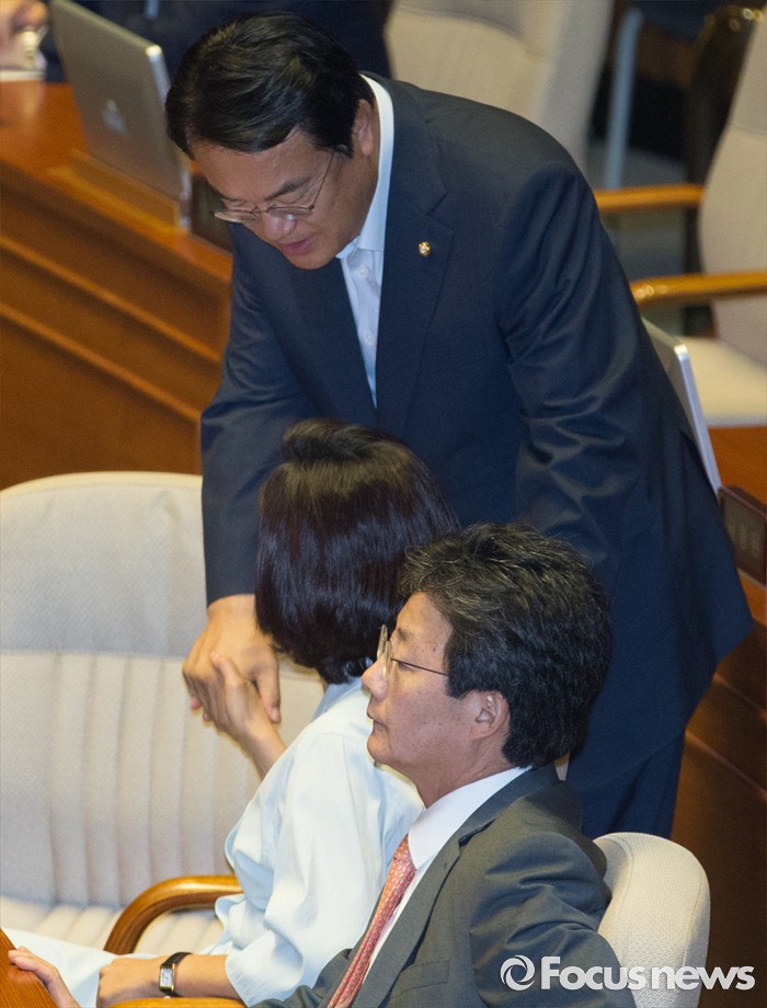 (서울=포커스뉴스) 20일 오전 서울 여의도 국회에서 열린 344회 국회(임시회) 2차 본회의, 사드(THAAD·고고도미사일방어체계) 배치에 대한 긴급현안질문에 참석한 정진석(왼쪽부터) 새누리당 원내대표, 나경원, 유승민 의원이 인사하고 있다.