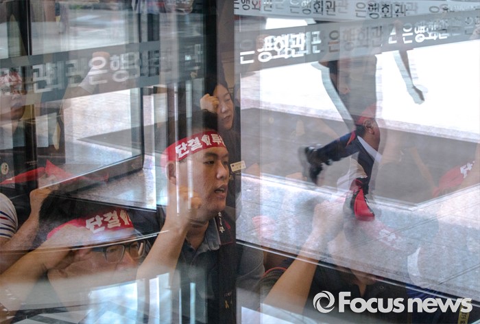 (서울=포커스뉴스) 20일 오전 서울 중구 은행회관에서 열린 '성과연봉제 도입 관련 총파업 1차 결의대회'에 참석한 금융노조 관계자들이 성과연봉제 도입을 규탄하며 구호를 외치고 있다.