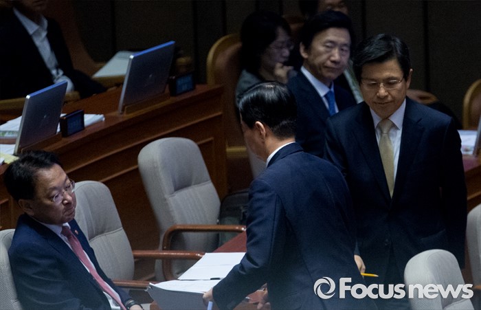 (서울=포커스뉴스) 20일 오전 서울 여의도 국회에서 열린 344회 국회(임시회) 2차 본회의, 사드(THAAD·고고도미사일방어체계) 배치에 대한 긴급현안질문에 참석한 황교안 국무총리, 한민구 국방부 장관이 각각 자리로 향하고 있다.