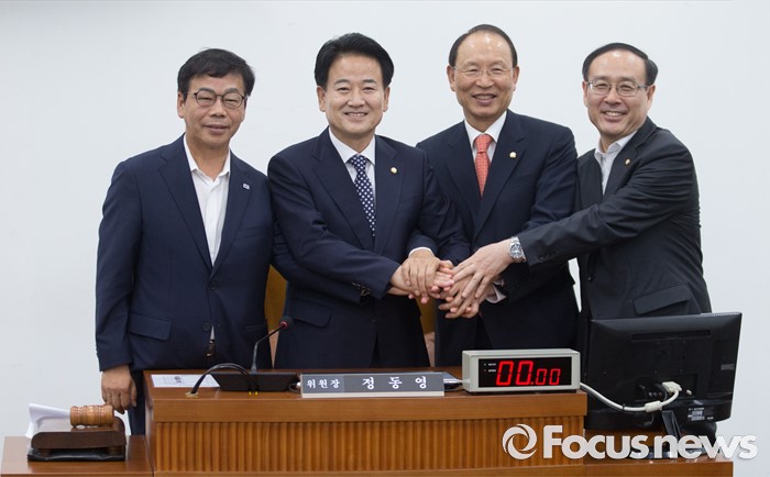 (서울=포커스뉴스) 20일 오전 서울 여의도 국회에서 열린 미래일자리 특별위원회 전체회의에 참석한 정동영 위원장과 3당 간사가 취재진을 향해 포즈를 취하고 있다. 왼쪽부터 이완영 새누리당 간사, 정 위원장, 최운열 더불어민주당 간사, 오세정 국민의당 간사.