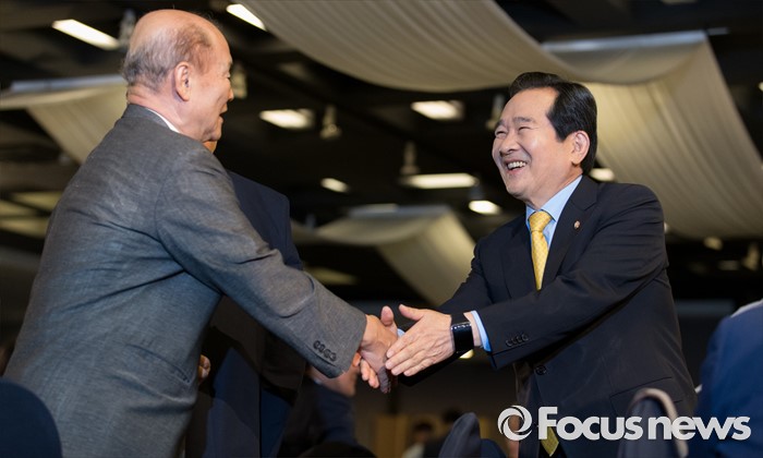 (서울=포커스뉴스) 정세균 국회의장이 20일 오전 서울 종로구 세종문화회관에서 열린 한국방송기자클럽 초청 토론회에서 참석자들과 인사를 나누고 있다.