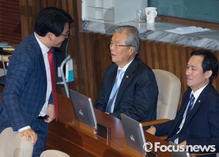(서울=포커스뉴스) 20일 오전 서울 여의도 국회에서 열린 344회 국회(임시회) 2차 본회의, 사드(THAAD·고고도미사일방어체계) 배치에 대한 긴급현안질문에 참석한 김종인(가운데) 더불어민주당 비대위 대표, 우상호(오른쪽) 원내대표, 박용진 대표비서실장이 대화하고 있다.