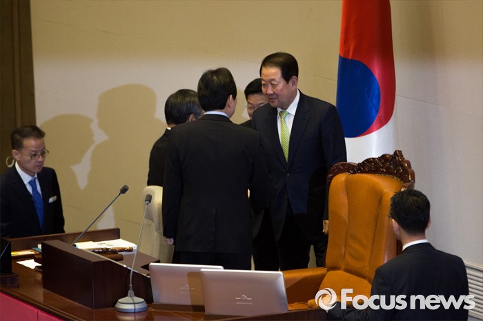 (서울=포커스뉴스) 정세균 국회의장과 박주선 국회부의장이 20일 오전 서울 여의도 국회에서 열린 344회 국회(임시회) 2차 본회의, 사드(THAAD, 고고도미사일방어체계) 배치에 대한 긴급현안질문에 참석해 악수 하고 있다.