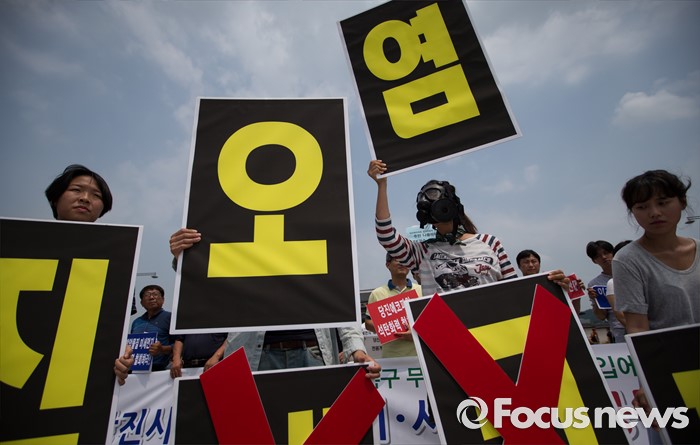 (서울=포커스뉴스) 당진시 송전선로 석탄화력 저지 범시민대책위원회 관계자들과 환경단체 회원들이 20일 오전 서울 종로구 광화문 광장에서 당진 에코파워 석탄화력발전소에 대한 전원개발실시계획 승인 신청 반려를 촉구하고 있다.