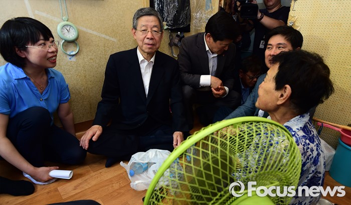 (서울=포커스뉴스) 김희옥(왼쪽 두번째) 새누리당 혁신비대위원장이 20일 오전 서울 중구 남대문 쪽방촌을 방문, 주민들과 대화하고 있다.