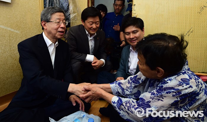 (서울=포커스뉴스) 김희옥(맨 왼쪽) 새누리당 혁신비대위원장이 20일 오전 서울 중구 남대문 쪽방촌을 방문, 주민들과 대화하고 있다.