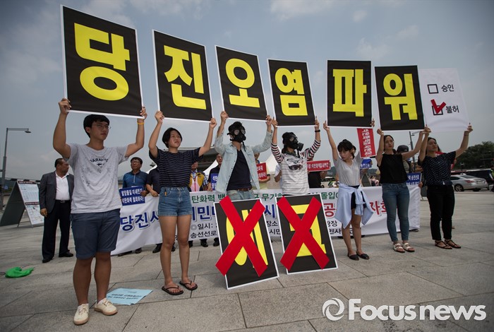 (서울=포커스뉴스) 당진시 송전선로 석탄화력 저지 범시민대책위원회 관계자들과 환경단체 회원들이 20일 오전 서울 종로구 광화문 광장에서 당진 에코파워 석탄화력발전소에 대한 전원개발실시계획 승인 신청 반려를 촉구하고 있다.
