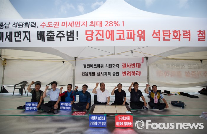 (서울=포커스뉴스) 당진시 송전선로 석탄화력 저지 범시민대책위원회 관계자들과 환경단체 회원들이 20일 오전 서울 종로구 광화문 광장에서 당진 에코파워 석탄화력발전소에 대한 전원개발실시계획 승인 신청 반려 기자회견을 마친 후 단식농성에 들어가고 있다.
