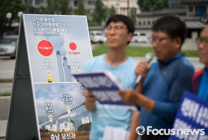 (서울=포커스뉴스) 당진시 송전선로 석탄화력 저지 범시민대책위원회 관계자들과 환경단체 회원들이 20일 오전 서울 종로구 광화문 광장에서 당진 에코파워 석탄화력발전소에 대한 전원개발실시계획 승인 신청 반려를 촉구하고 있다.