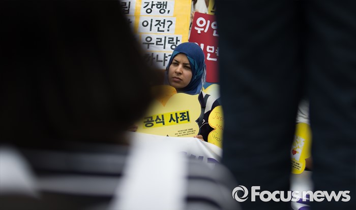 (서울=포커스뉴스) 20일 오후 서울 종로구 옛 일본대사관 앞에서 열린 제1240차 일본군 위안부 문제해결을 위한 정기 수요집회에 참석한 한 외국인이 일본 공식 사죄를 요구하는 손피켓을 들고 있다.