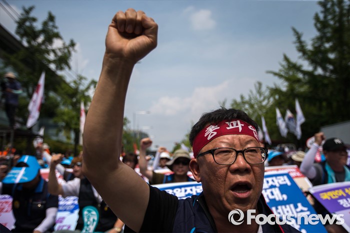 (서울=포커스뉴스) 20일 오후 서울 여의도 산업은행 앞에서 '민주노총 총파업 총력투쟁' 결의대회가 열리고 있다. 이번 결의대회에서 민노총 조합원들은 한상균 민노총 위원장 실형선고, 성과연봉제 등을 규탄했다.