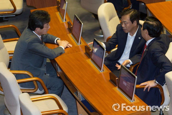 (서울=포커스뉴스) 20일 오후 서울 여의도 국회에서 열린 344회 국회(임시회) 2차 본회의, 사드(THAAD·고고도미사일방어체계) 배치에 대한 긴급현안질문에 참석한 유승민(왼쪽부터), 이완영, 김성찬 새누리당 의원이 대화하고 있다.