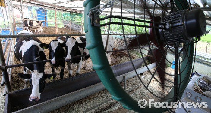 (세종=포커스뉴스) 폭염주의보가 발령된 20일 오후 세종시 한 농장에서 젖소들이 대형 선풍기 바람에 더위를 식히고 있다.