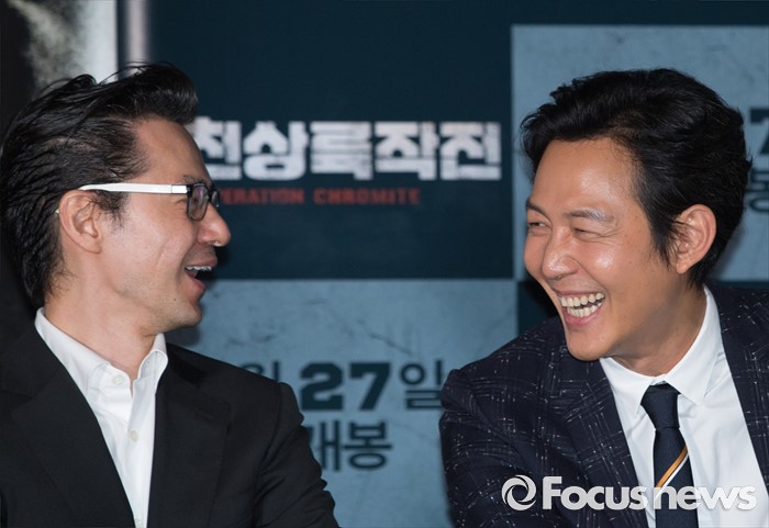 (서울=포커스뉴스) 20일 오후 서울 성동구 왕십리 CGV에서 열린 영화 '인천상륙작전' 언론시사회에 참석한 이재한(왼쪽)감독과 배우 이정재가 미소를 짓고 있다.